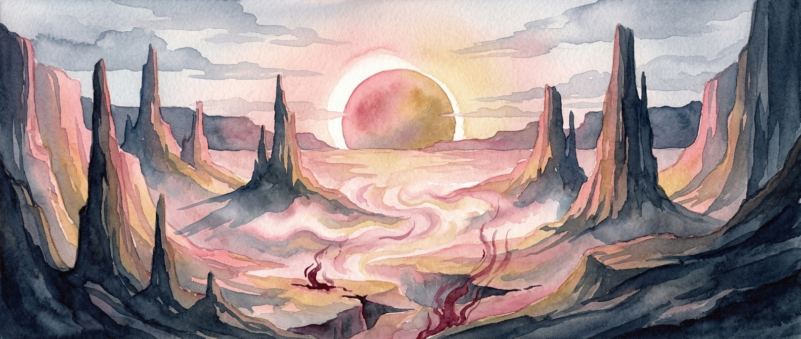 Pour l’entourer, j’ai choisi des fleurs roses vaporeuses, des baies rouge sang et des feuilles bleu-gris, tout posés sur un fond d’or chaud — comme un autel, tu vois ? Ce contraste entre la douceur du rose et la profondeur du rouge grenat, c’était important pour moi. Et puis il y a cette deuxième pièce, son monde à lui : un canyon balayé par un ciel d’orage ardoise, traversé d’un seul rayon d’or, avec en son centre une éclipse — ce soleil rose cerclé de lumière, suspendu entre deux falaises comme une braise qui refuse de s’éteindre. C’est là qu’il vit, ce gardien. Dans cet entre-deux, ce moment suspendu juste avant que tout bascule.