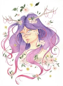 Je l’ai peinte sur papier coton 300g, et cette texture granuleuse a donné aux aplats de rose poudré et de prune quelque chose de vivant, presque de velouté. C’est une œuvre qui m’a demandé de la lenteur et de la tendresse — chaque petite fleur posée une à une, chaque perle ponctuée au fin pinceau. Elle me ressemble dans ce qu’elle dit : que la magie, ce n’est pas forcément quelque chose de sombre ou d’intimidant. Parfois, elle a des cheveux roses et elle sent les fleurs de cerisier.